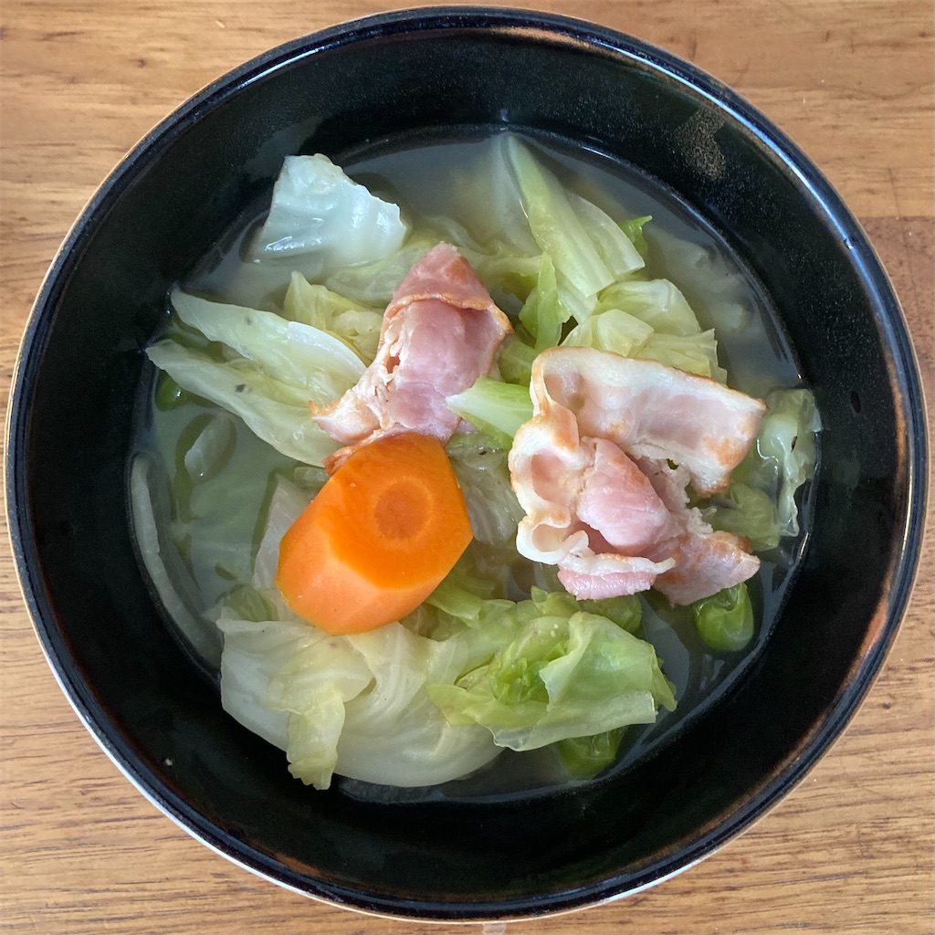 2025-05-24 31食目「キャベツ多めの野菜スープ」 お好み焼きで使った残りのキャベツ、にんじん、玉ねぎがあったのでレシピのアイデアを生成AIに質問したらコンソメを使った野菜スープをおすすめされる。野菜を煮てコンソメを入れて塩胡椒で味付けするだけで簡単。ベーコンで肉を摂取して美味しくいただいた。